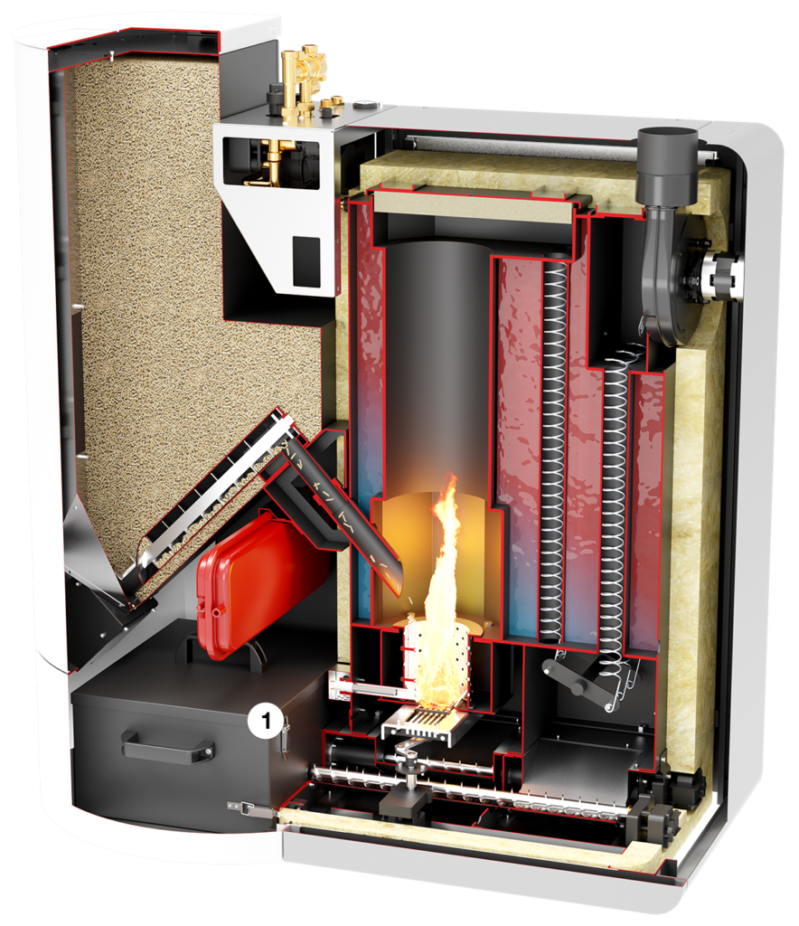 1. Le ceneri prodotte dalla combustione e i residui rimossi dal sistema automatico di pulizia dei fumi, vengono convogliati verso una valigetta a doppio vano. L’utente finale non ha più il compito di svuotare periodicamente il cassetto cenere, ma solamente quello di controllare la valigetta e svuotarla quando è completamente piena. La valigetta è estraibile e di facile pulizia. Abbinata al sistema del braciere autopulente, il compattatore cenere rende la caldaia autonoma e riduce notevolmente le operazioni di pulizia a carico dell’utente.